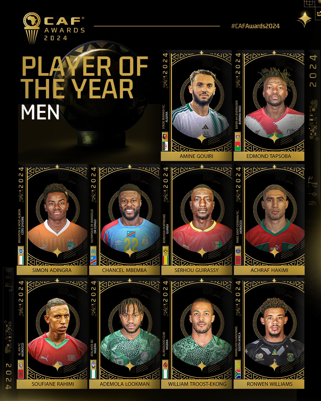 Ivory Coast’s Simon Adingra makes the cut following an impressive club season, while DR Congo’s Chancel Mbemba and Guinea’s Serhou Guirassy secured their spots thanks to exceptional performances over the year. Burkina Faso’s Edmond Tapsoba and South Africa’s Ronwen Williams complete the list, reflecting the wide-ranging talent across Africa.