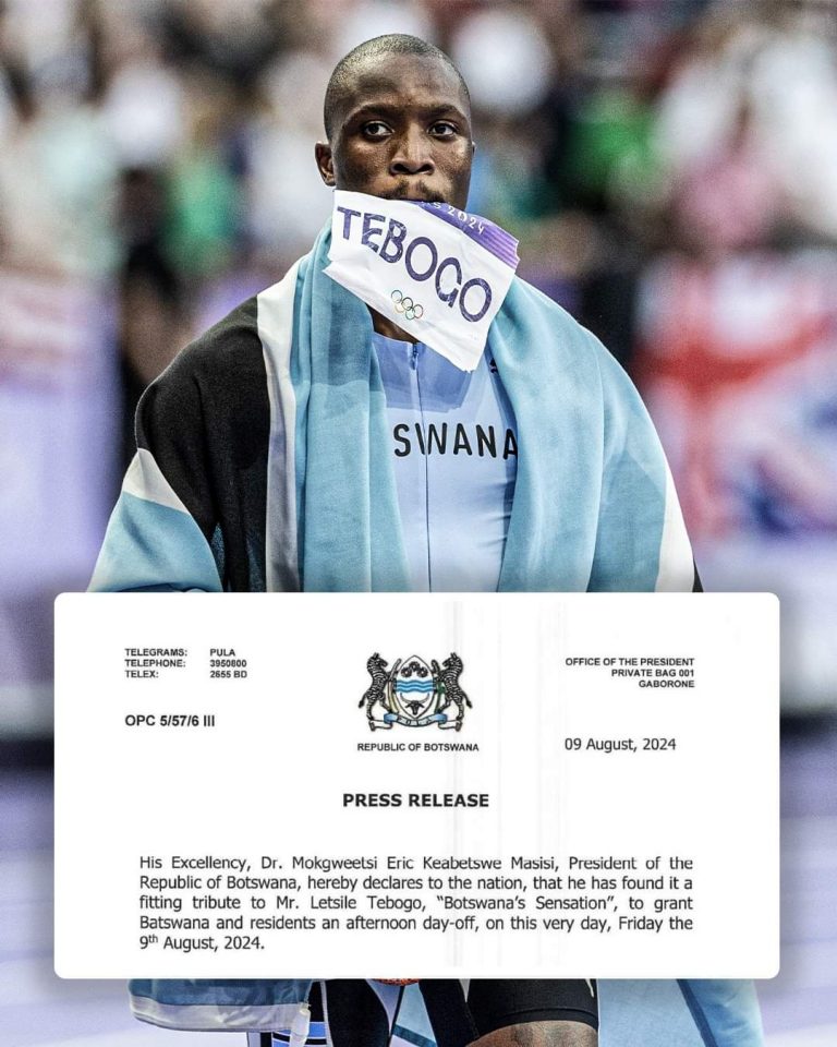 Botswana’s President, Mokgweetsi Masisi, has declared an afternoon day-off today, August 9, 2024, to honor Letsile Tebogo, the country’s first-ever Olympic gold medalist in the 200m. This holiday celebrates Tebogo’s historic achievement as both the first Motswana and the first African to win gold in this event.