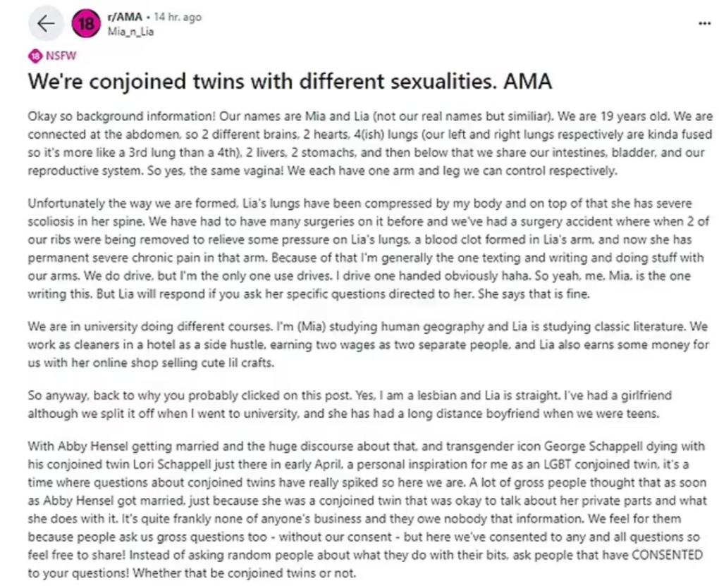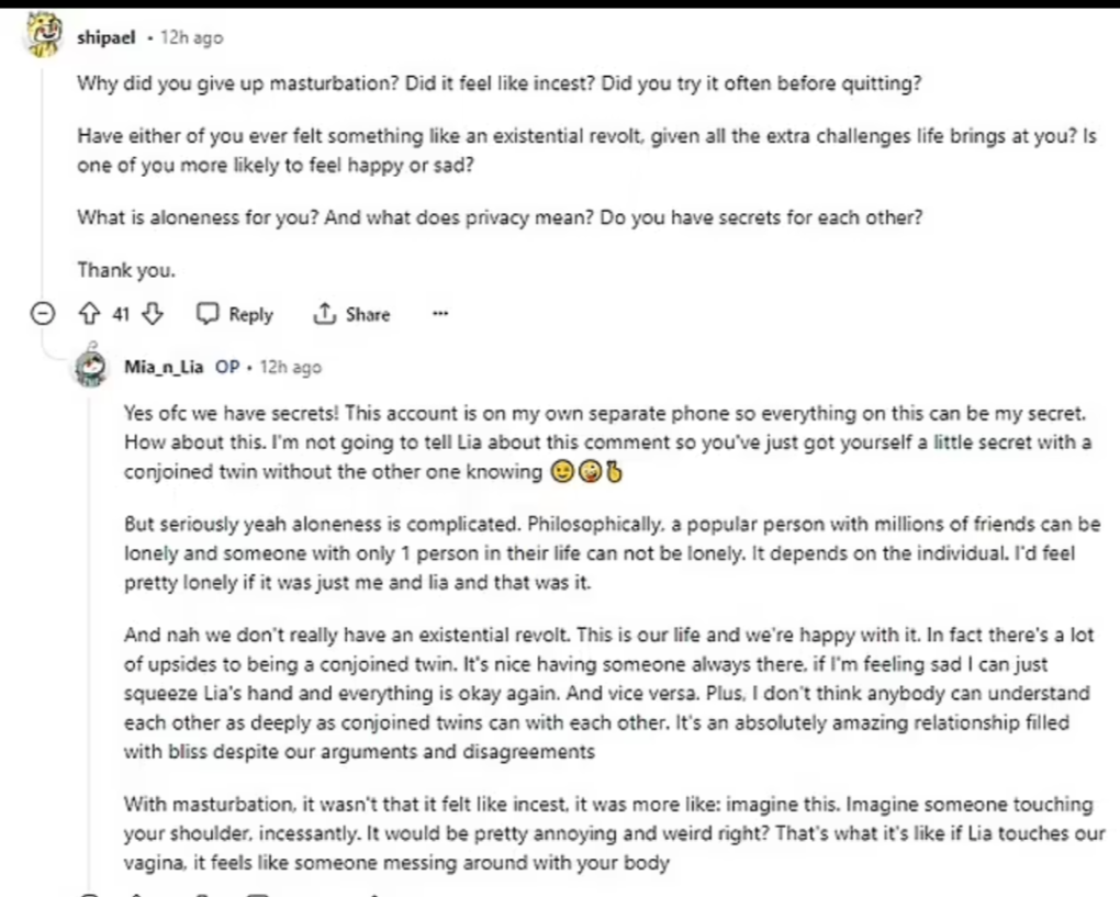 In a Reddit AMA (Ask Me Anything) thread, Mia and Lia explained the challenges they face, including discomfort with masturbation due to sharing the same anatomy. Mia clarified that Lia’s lungs have been affected by compression from their shared body, alongside Lia’s severe scoliosis.