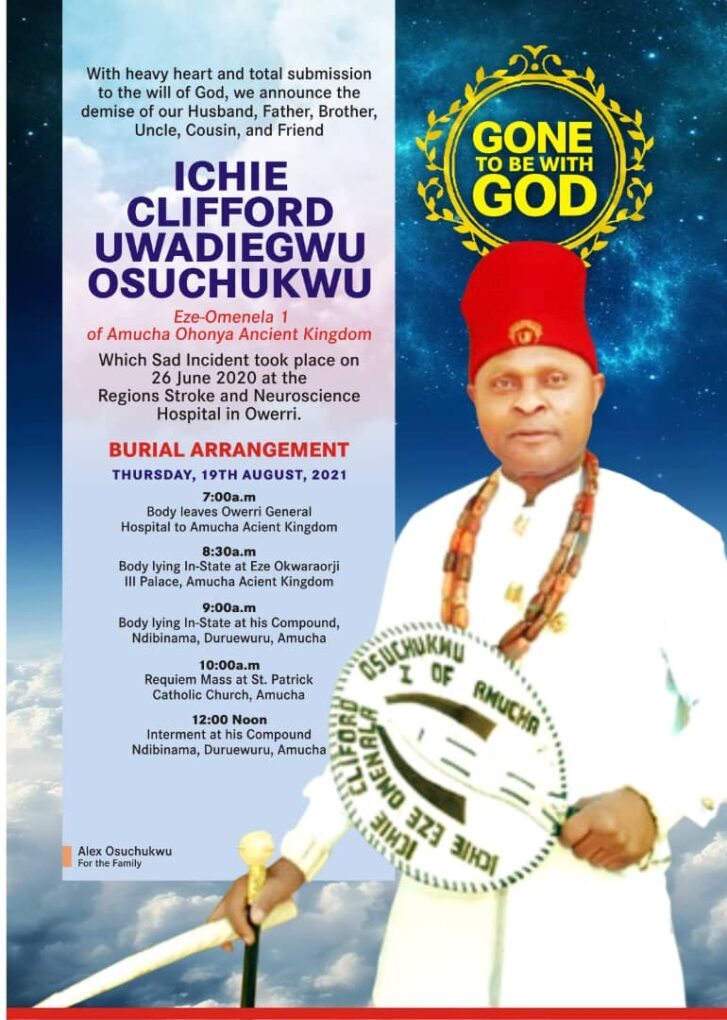 The families of late Chief Clifford Osuchukwu “Eze-Omenala 1” of Amucha Ohonya Ancient Kingdom of Imo State have announced the burial arrangement of late Chief Osuchukwu who was one of the leaders of the Igbo community in Finland until the cold hands of death snatched him away.