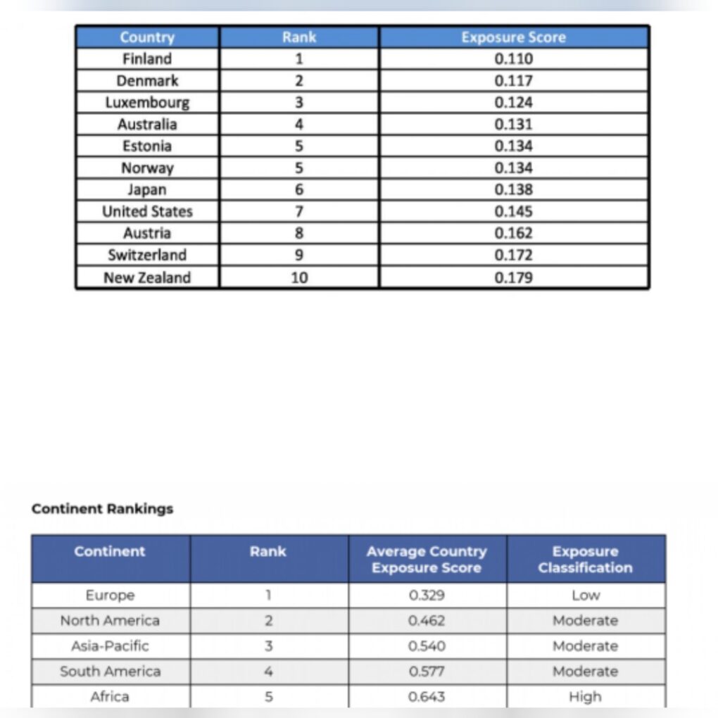 Europe has the lowest exposure score per country (0.329).70.73% of European countries are classified in the low and very low exposure groups.
