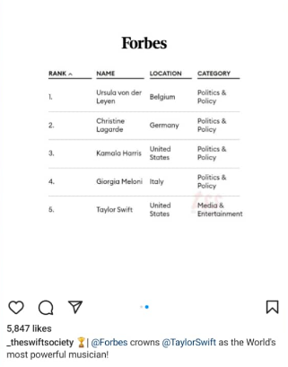 Also coming in ahead of Swift is U.S. Vice President Kamala Harris, who came in third, and Italian prime minister Giorgia Meloni at number 4.