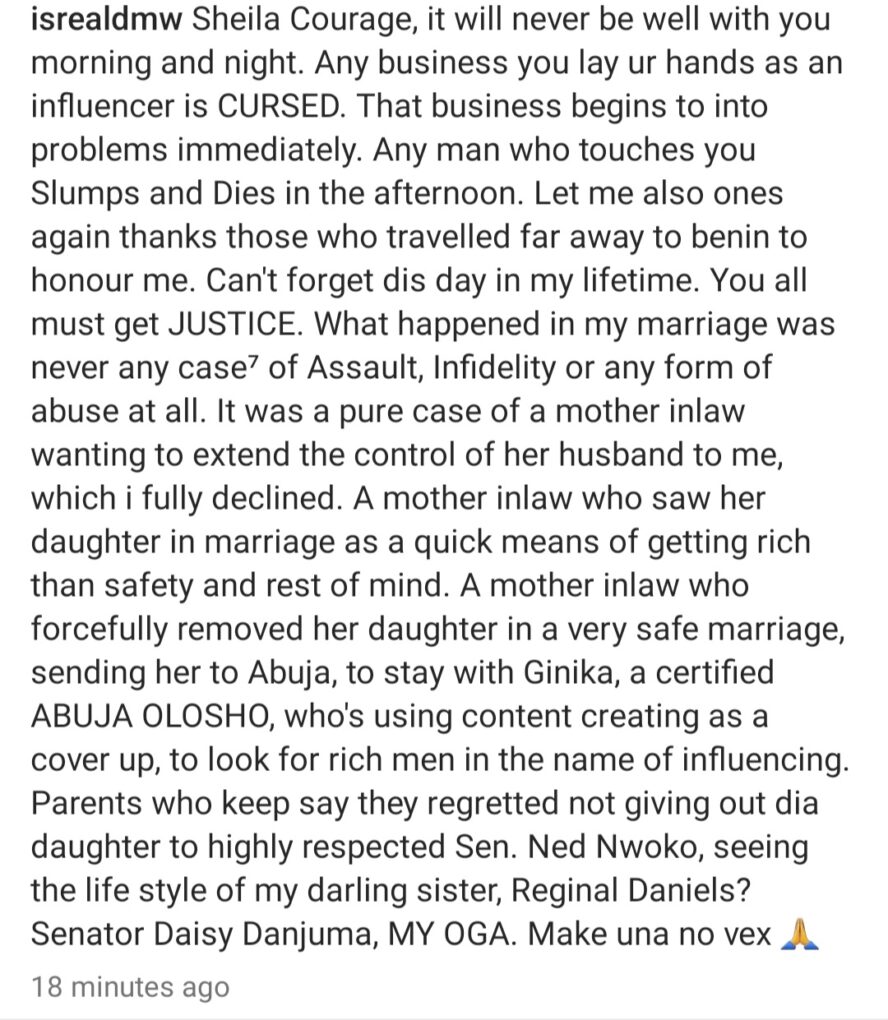 She stated this on her Instagram page hours after Israel called her out again on social media and rained heavy curses on her. read here