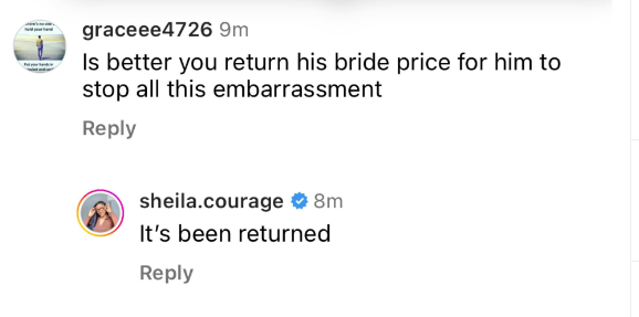 A concerned follower of Sheila appealed to her to return his bride price to stop him from ‘’embarrassing” her further.