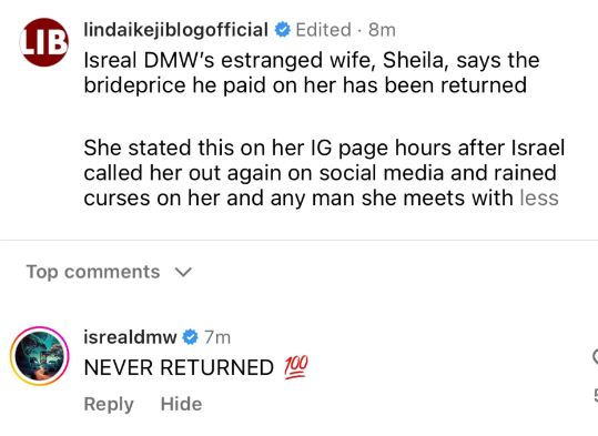 However, Isreal responded by saying he is yet to get a refund of the bride price he paid on Sheila.