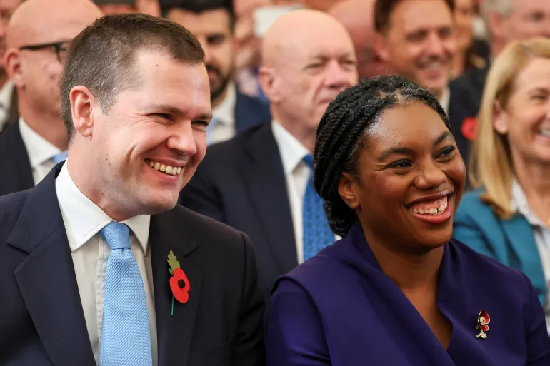 Kemi Badenoch sits next to Robert Jenrick on the day she was announced as the new Conservative leader, in London, UK [Mina Kim/Reuters]