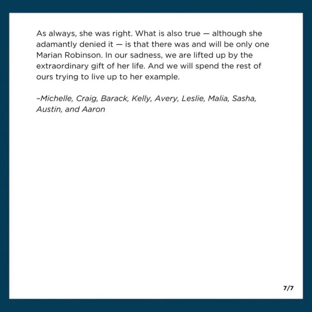 The family statement was jointly released by Michelle and Barack Obama, Craig Robinson and his wife, Kelly, along with Marian Robinson’s grandchildren: Avery, Leslie, Malia, Sasha, Austin, and Aaron.