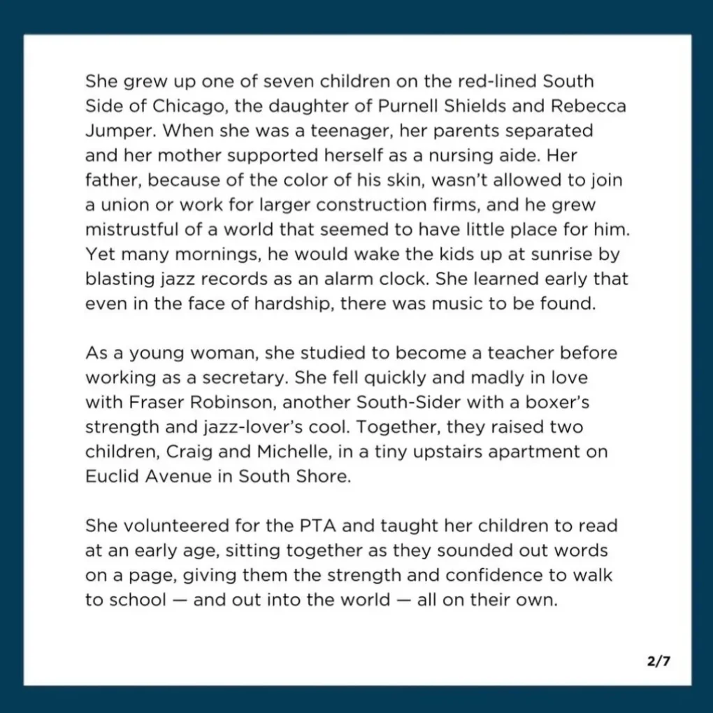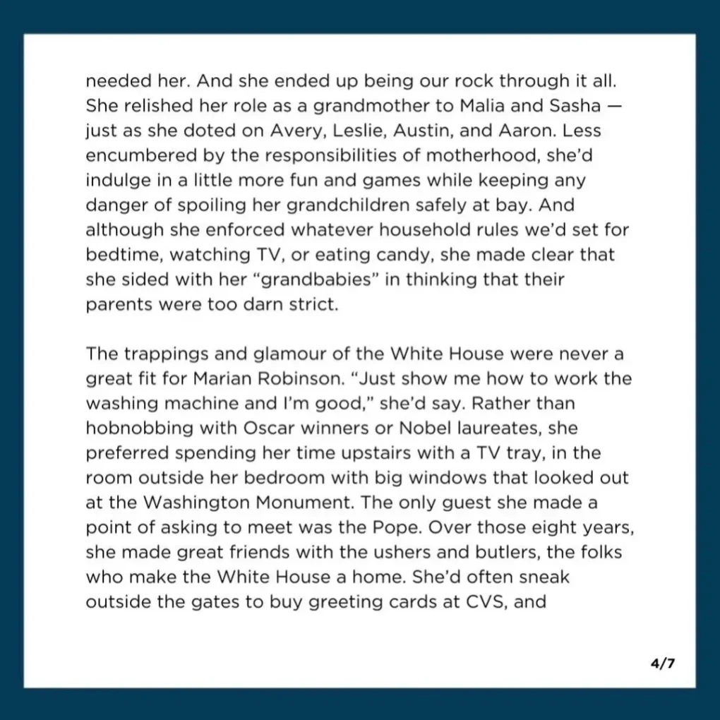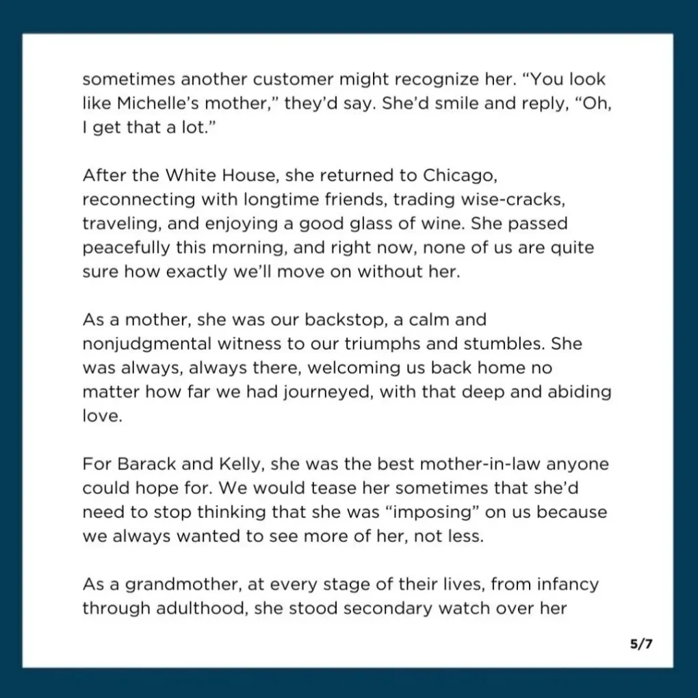 The family statement was jointly released by Michelle and Barack Obama, Craig Robinson and his wife, Kelly, along with Marian Robinson’s grandchildren: Avery, Leslie, Malia, Sasha, Austin, and Aaron.