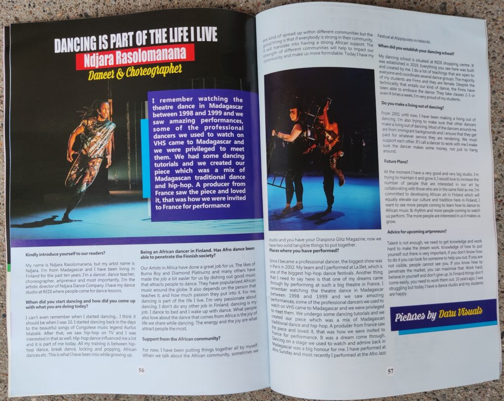 Since I became a professional dancer, the biggest show was in Paris in 2002. My team and I performed at La Illet, which is one of the biggest hip-hop dance festivals. Another thing that I need to say here is that one of my dreams came through by performing at such a big theatre in France. I remember watching the theatre dance in Madagascar between 1998 and 1999 and we saw amazing performances, Some of the professional dancers we used to watch on VHS came to Madagascar and we were privileged to meet them. We undergo some dancing tutorials and we created our piece which was a mix of Madagascan traditional dance and hip-hop. A producer from France saw the piece and loved it, that was how we were invited to France for performance. It was a dream come through. Dancing on a stage we used to watch and admire back in Madagascar was a big honour for me. I have performed at Afro Sunday and most recently I performed at the Afro Jazz Festival at Alppipuisto in Helsinki.