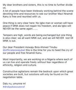 He stressed that true peace and stability in Igboland cannot be achieved without Kanu’s freedom. In a message shared on his social media page, Obi Cubana expressed deep concern over the rising insecurity across the nation.