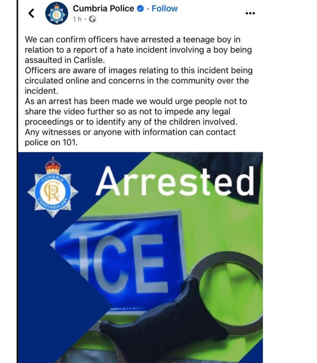 The Cumbria police department has now confirmed the arrest of the white teenager over the incident which occurred in Carlisle, United Kingdom.