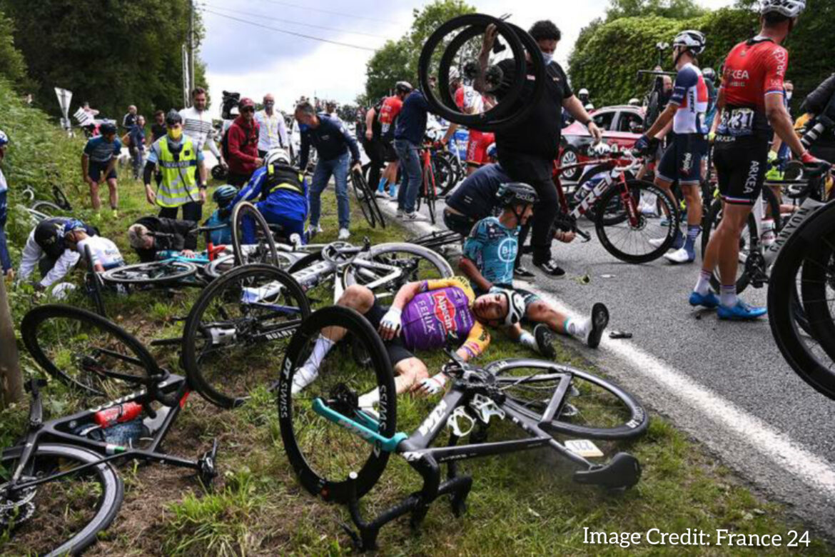 A spectator who leant into the path of the speeding peloton holding up a sign that read “Allez Opi-Omi!,” (a mix of French and German for “Let’s Go Grandpa-Grandma!”) caused the greatest Tour de France crash in recent times. The sign collided with Tony Martin with some 45kms left in the race.