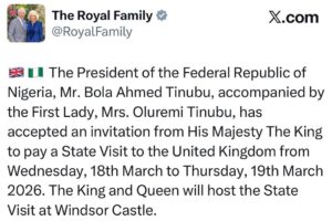 President Bola Tinubu and First Lady Oluremi Tinubu will make a two-day state visit to the United Kingdom from March 18–19, 2026. The Royal Family announced on X (formerly Twitter) that the visit is by invitation of King Charles. During the trip, the King and Queen Consort will host the Nigerian leaders at Windsor Castle.