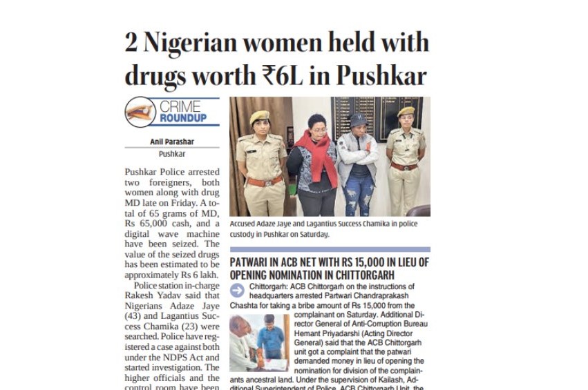 Two Nigerian women, Adaeze Jaye, 43, and Success Chamika, 23, have been arrested with drugs worth over N63m in Rajasthan, India.
